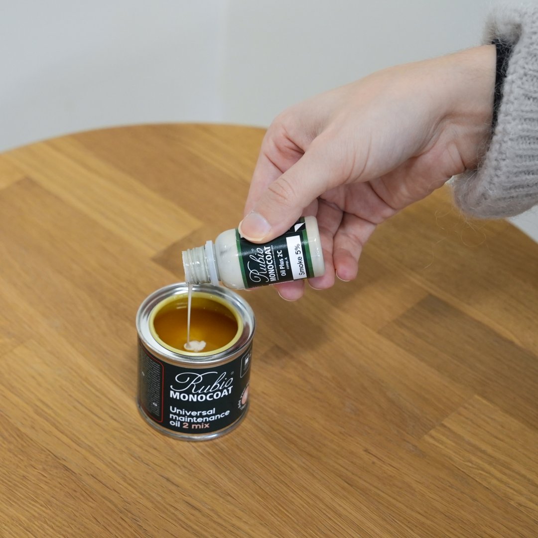 - Olie mengen: Meng Universal Maintenance Oil met de juiste kleur Oil Plus 2C component A in de verhouding 3:1.